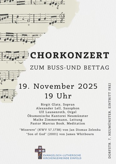 In der Christuskirche in der Dorfstraße 9 in Neumünster-Einfeld, singt am Mittwoch, dem 19. November 2025, um 19:00 Uhr die dort beheimatete Ökumenische Kantorei Neumünster unter Leitung von Maike Zimmermann.
